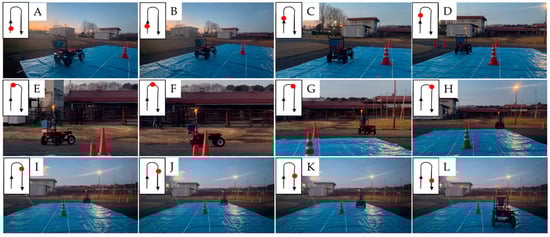 Broadcasting of seeds using the autonomous vehicle in the experimental field (A–L represent the position of the seeder at each location of the grid).