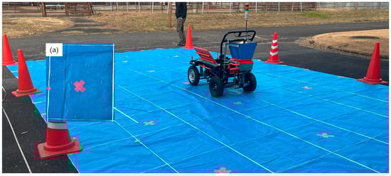 The seeder’s spindle shaft was connected to a 12 V motor, and a voltage regulator was used to control the speed of rotation. The servo motors were controlled using an I2C Adafruit 16-Channel 12-bit PWM/Servo Driver (Rasbee® PCA9685, SunFounder, Shenzhen, China), two 5 V servo motors were attached to the seed metering unit, and the 24 V servo was used to manage the steering. An RTK-GNSS rover module (U-blox® C94-M8P Application Kit, Thalwil, Switzerland) was attached to the vehicle after the rover and connected with the base station established at the Tsukuba-Plant Innovation Research Center (T-PIRC) located inside the University of Tsukuba (Japan). GNSS signals were used to record the pathway of the moving autonomous seeder during the designed pathway of the experiments, which was pre-programmed.