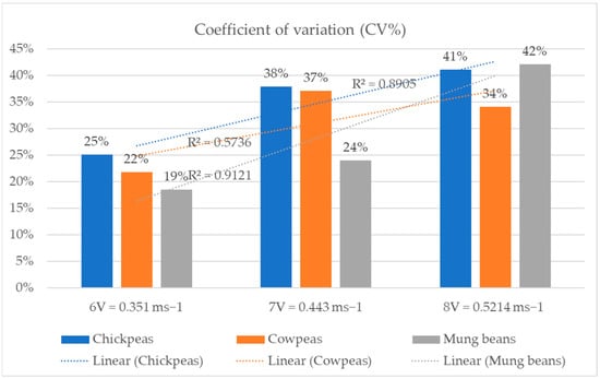 - The broadcasting system was tested to identify seed distribution, and results show that at the speed of 0.351 ms−1 the coefficient of variation for cowpea, mung bean, and chickpea was 22%, 19%, and 25%, respectively.