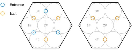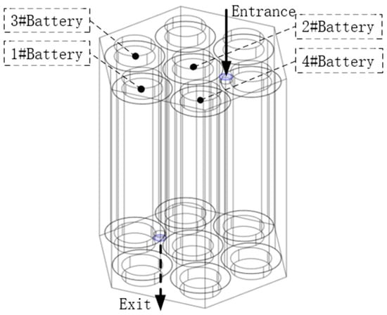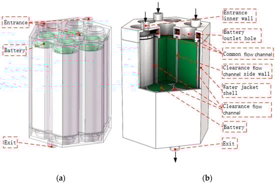 Compared with natural cooling and forced air cooling, the liquid flow method of cooling batteries is widely used because of its high efficiency, reliability, and other characteristics []. However, the extra weight of the coolant itself, the coolant flow channels, and the sealing elements used to avoid coolant leakage increase the manufacturing cost of the coolant circulation system, which is a disadvantage of the liquid cooling method []. For liquid cooling of cylindrical cells, all methods proposed or in use today require a certain gap between all the individual cells in the diameter direction to allow a coolant flow path to pass through, which undoubtedly increases the size of the battery pack and reduces its volumetric energy density. The longitudinal-flow heat dissipation method proposed in this paper aims to eliminate this gap by exploiting the arrangement characteristics of cylindrical Li-ion cells and using their arranged pores as coolant flow paths to pass cooling media along the axial direction of the cells for heat dissipation. This approach allows the cylindrical cells to be closely arranged, which not only reduces the material and weight of the coolant flow channel but also increases the volumetric energy density of the whole battery pack.