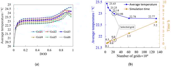 One of the batteries is selected as the research object, its average temperature is calculated under the above five meshing conditions, and the simulation results are obtained as shown in Figure 2a. It can be seen from the figure that the greater the number of grids, the lower the average temperature. The maximum temperature difference of the five cases is within ±0.5 °C. The average temperature shown in the main axis of Figure 2b is the value when the Depth of Discharge (DOD) in Figure 2a is 50%, and the time shown in the secondary axis is the number of hours consumed in the complete discharge simulation of the battery pack. As can be seen from the graph, the time required for the simulation increases proportionally with the number of grids, while the difference in the average temperature after the refinement of grid 5 is small and can be ignored. In order to balance simulation accuracy and efficiency, grid 4 is selected for the simulation model used in this paper.
