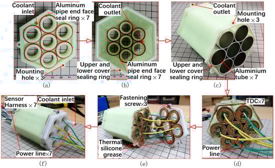 Assembly process and structural principle of battery pack prototype with Gap flow channel: (a) after the upper cover has the seal attached; (b) after the lower cover has the seal attached; (c) after the lower cover is loaded into the aluminum tube; (d) after the lower cover is loaded with the TDC; (e) before the upper and lower covers are combined; (f) after the upper and lower covers are tightened.