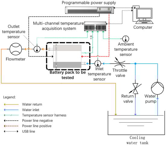 In order to verify the feasibility of the new liquid cooling scheme based on the above battery pack prototype, a dedicated test bench needs to be built to establish the coolant circulation, signal sampling, and power supply []. In this paper, a test bench scheme is designed, as shown in Figure 5.