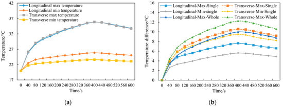 Comparison of longitudinal-flow and transverse-flow simulation based on actual working conditions: (a) maximum and minimum temperature profile of the battery pack during discharging; (b) the maximum and minimum curves of the maximum temperature difference between the individual cells in the battery pack, and the maximum temperature difference curve of the battery pack as a whole.