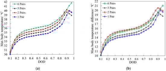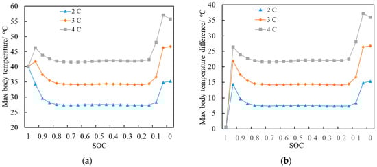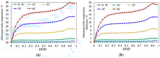 The maximum body temperature and maximum temperature difference of the battery pack at different discharge rates: (a) maximum body temperature; (b) maximum body temperature difference.