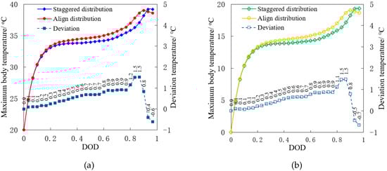 Temperature change curve when the battery pack is in a high temperature environment: (a) maximum body temperature; (b) maximum body temperature difference.