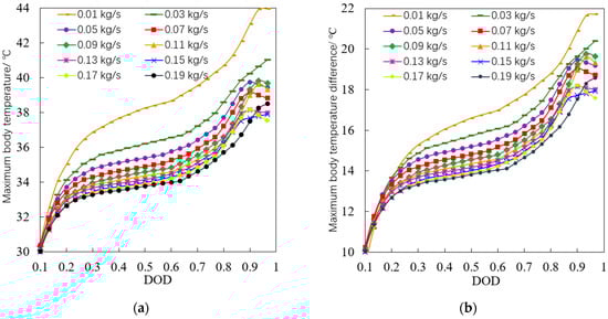 As can be seen from the figures, the maximum body temperature and maximum body temperature difference of the battery pack have approximately the same trend of change throughout the discharge process. In the stage of DOD of 10~85%, the temperature values shown in both figures decrease with the gradual increase in the flow rate, but the magnitude of the decrease is gradually decreasing. There is no such pattern at the stage of DOD of 85% to 100%. During the whole discharge process, the relationship between the extreme value of the maximum body temperature, the maximum body temperature difference, and the flow rate is shown in Figure 12.