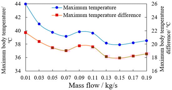 The relationship between flow rate and cell temperature is investigated according to the entrance and exit scheme determined in the previous section. The battery is discharged at 4C condition, the coolant flow rate is gradually increased from 0.01 kg/s to 0.19 kg/s, and the change in the maximum temperature and maximum temperature difference of the battery pack is recorded. The simulation results are shown in Figure 11.