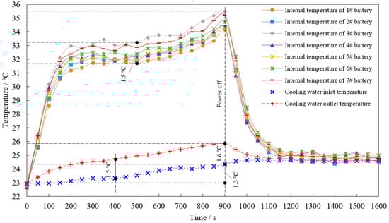 The test was conducted at room temperature of 23 °C. As can be seen from the Figure 15, the internal temperature of all seven TDCs rose rapidly with the power on, reached the first peak after 200 s, then maintained a steady increase until the second peak at 900 s, and then dropped rapidly with the power off immediately. The cooling water outlet temperature rises slowly as the power is turned on and gradually decreases after the power is turned off. The cooling water inlet temperature also increased slightly during the test, and finally, the cooling water outlet temperature and the internal temperature of the seven TDCs both returned to the same relatively stable value. Due to the self-heating effect of the pump, the cooling water inlet temperature also gradually increased as the test was carried out, and its maximum temperature rise was 1.3 °C. The maximum temperature rise of the outlet cooling water is 2.9 °C, minus the rise in the inlet water temperature, and the maximum value of the temperature difference between the inlet and outlet cooling water is 1.6 °C. It can be converted into heat according to Formula (11).