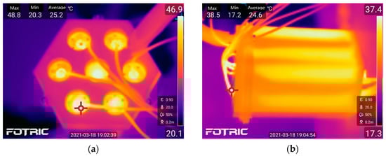 It can be seen from Figure 16a that there is no obvious distinction between light and dark in the thermal image of the end faces of the seven TDCs, and the temperature is relatively uniform. Consistent with the simulation results, the maximum temperature of the end face of each TDC is located at the center of the end face circle. The highest temperature in this figure reached 48.8 °C. In addition, it can be seen that the wire temperature is quite high, and the closer it is to the TDCs, the higher its temperature is. In Figure 16b, the position of the TDCs in the battery pack is clearly visible. The surface temperature near the corner and edge gap channel is significantly lower than that near the TDCs. In addition, by comparing Figure 16a,b, it can be seen that the average temperature at the side of the battery pack is slightly lower than that at the end.