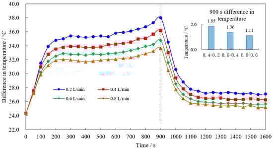 It can be seen that the average temperature of TDCs is closely related to the coolant flow and decreases with the increase in coolant flow. However, when the coolant flow increases in the sequence of equal difference, the temperature drop gradually decreases. Taking the data in the 900th second in Figure 17 as an example, when the flow rate is gradually increased, the corresponding temperature difference is 1.85 °C, 1.36 °C, and 1.11 °C, and the reduction range is gradually reduced. It can be concluded that there is an upper limit to improving the cooling effect by increasing the flow rate, which is consistent with the above simulation results.