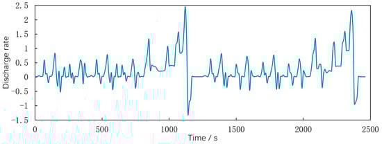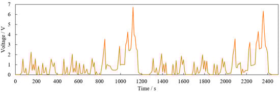 In order to further verify the feasibility of the liquid cooling method proposed in this paper, the NEDC working condition is used for loading in the test bench of this paper. First, in the lumped parameter battery model, the thermal power of the battery is obtained by numerical simulation according to the discharge rate shown in Figure 18 and then converted into the curve of the supply voltage of the TDCs with time according to Ohm’s law, as shown in Figure 19. The resistance value used for conversion is the average value of seven TDCs given in Table 4.