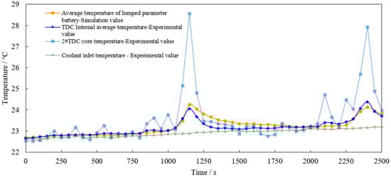 After the curve is discretized in 10 s, it is loaded into the programmable power supply and output to the TDC pack. The total output time is 2500 s, including two NEDC cycle conditions. During the test, the internal temperature of each TDC was measured, and the average value was taken. At the same time, the core temperature of No. 2 TDC was measured and plotted together with the simulation results into the curve shown in Figure 20.