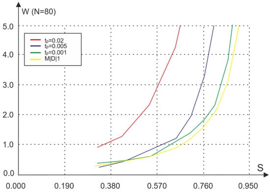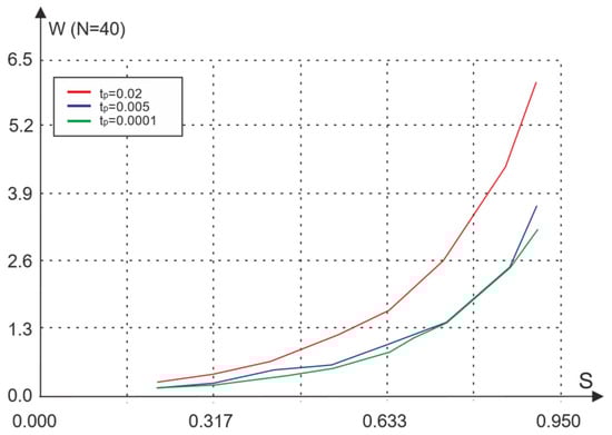Dependence of the average transmission time W on the traffic S depending on the signal propagation time tp.