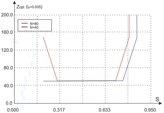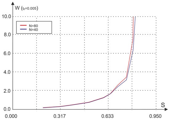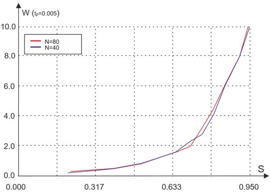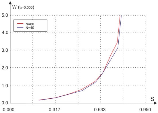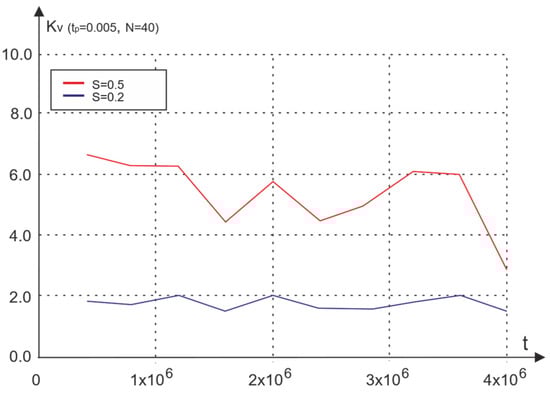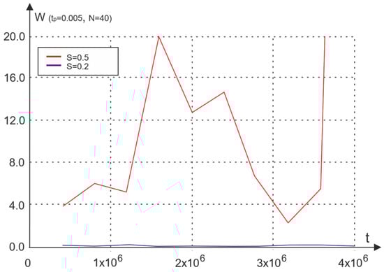 As an example, Figure 7 shows the graphs of the average packet transmission waiting time versus the operation time t, normalized with respect to tp, for two different traffic values, S = 0.2 and S = 0.5. If, at low traffic (S = 0.2), the network behavior can be called stationary and the efficiency does not change on average with time, then with traffic growth, the network behavior is clearly undulating, becoming non-stationary and unstable.