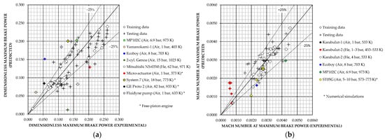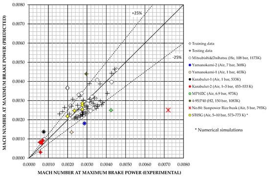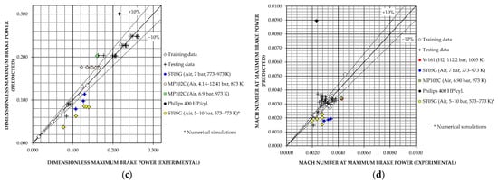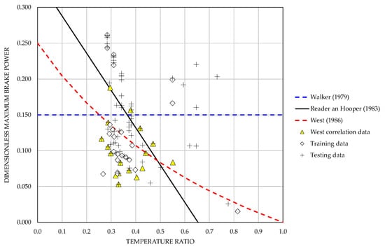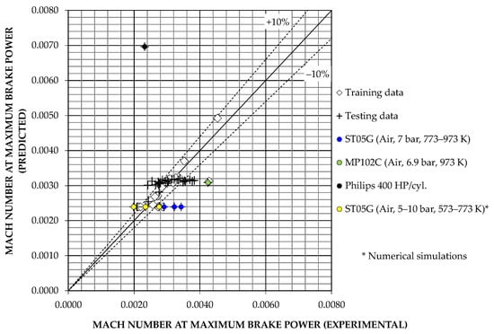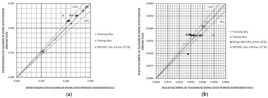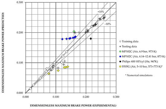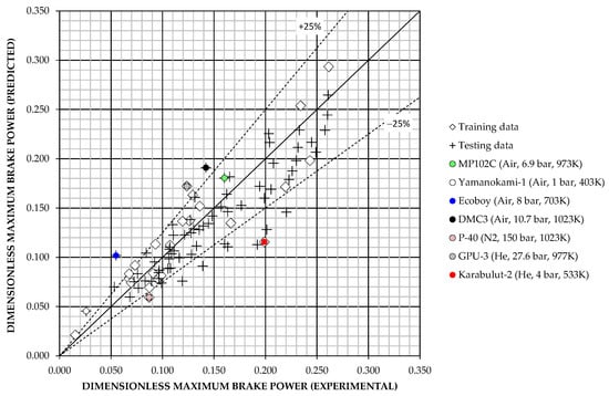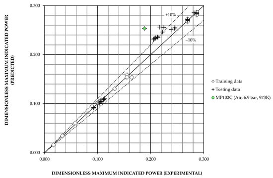 Figure 3 provides a picture of the dispersion between the 89 dimensionless maximum brake power data points included in Table A1 and Table A2, and the predictions based on Equations (9)–(11).