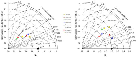 Taylor diagrams to compare training results as a function of the number of neurons: (a) G1-3ANN model; (b) G1-4ANN model.