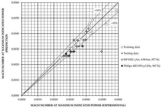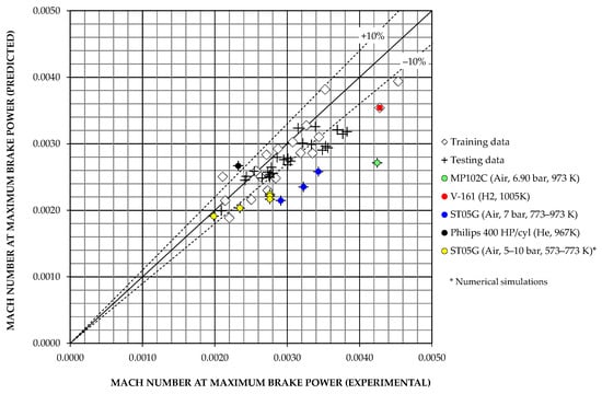 This equation fits, with RRMSE = 25.3% and , the 82 total operating points that result after excluding the FPSE data, because of their different operating principle, and operating point No. 84, because its value is significantly higher than those known for engines with a kinematic drive mechanism, from Table A1 and Table A2. Figure 5 facilitates comparisons between data and model predictions.