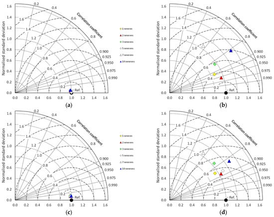 Taylor diagrams have been recommended for visualising results in model analyses [52]. In this article, this type of chart is used as an alternative to the usual scatterplots, because it provides a concise statistical summary of how well patterns match each other in terms of their correlation, their root-mean-square difference, and the ratio of their variances. The Taylor diagram is based on the definition of the centred pattern RMS difference [52], which is related to key statistical indicators by means of the following equations: