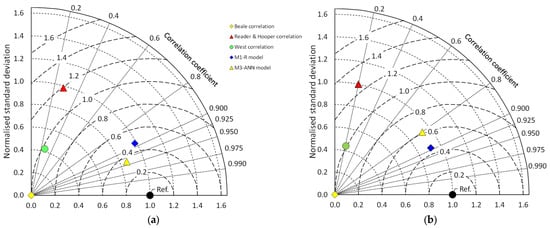 Various criteria have been proposed to assess the fit between the experimental data and model estimates, but none of them is free of limitations [48]. Since the percentage results facilitate interpretations, in this article, the performance of the models is assessed using dimensionless statistical indicators, namely the relative root mean square error RRMSE, the relative mean bias error RMBE, and the coefficient of determination . The RRMSE value is used as an optimisation criterion for both least squares regression-based models, and for training ANN-based models. To facilitate comparisons with results from other authors, the Nash–Sutcliffe coefficient of model efficiency, NSE, and the normalised values of the root mean square error and mean bias error, NRMSE and NMBE, respectively, have also been calculated, using the mean values of the experimental data as references for the latter two. values range from 0 to 1, and NSE values range from −∞ to 1. Negative NSE values suggest that the mean of the measurements is a better predictor than the model estimates themselves [49]. Some authors warn against the risk of identifying the meaning of and NSE [50], while others try to avoid confusion by classifying the former as an indicator of dispersion and the latter as an indicator of overall performance [51]. For example, while indicates that the model explains 80% of the variance in the observed data, the value has a very different meaning, i.e., that the model mean squared error represents 20% of the observed variance. The cause of possible confusion may be that can be interpreted as a maximum potential value for NSE, as the following equation reduces to for the optimal case of and [49]: