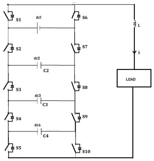A 31-level MPUC inverter circuit was designed, and its performance with respect to output voltage and the harmonics produced were analyzed. The proposed modified PUC inverter used five pairs of power electronic switches (S1–S6, S2–S7, S3–S8, S4–S9, and S5–S10) connected across the DC source connected to dc1 and three capacitors (C2, C3, and C4, respectively). Considering dc1 as a reference, then the other voltage levels are given as: