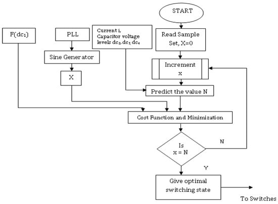 There are several modulation techniques used for switching the power devices in an MLI. These include Pulse Width Modulation (PWM) [,,,], Voltage balancing [,], Algorithmic-Controller-based PWM [,,,,], and Artificial-Intelligence-based Controller [,,]. In this work, a model predictive control algorithm was used to predict the width and instance of the switching pulses based on a reference sine wave. A model predictive control algorithm was used in this inverter, and its workflow is depicted below in Figure 3.