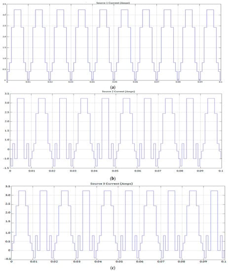 The inputs used for the simulation of the nine-level MLI and the corresponding outputs are depicted below. Figure 4a–c represents the input current sources one, two, and three of the nine-level multi-level inverter. The ranges of the different input sources used are: (i) current sources one, two, and three, ranging up to 3.24 Amps; (ii) current source two, ranging up to 3.24 Amps; and (iii) input current source three, which is 3.24 Amps.
