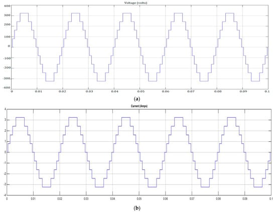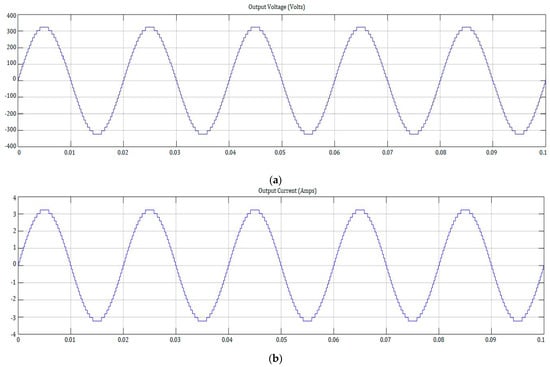 The simulation output of the 31-level MPUC multi-level inverter is as given below in Figure 7a,b. Figure 7a represents the output voltage of the 31-level multi-level inverter, and Figure 7b represents the output current. The 31-level MLI has an output voltage of 325 V with reduced switching loss and harmonic distortion. The overall output current for the 31-level MLI is 3.24 A. The Table 4 shows the Input and output values of 31-level MPUC inverter.