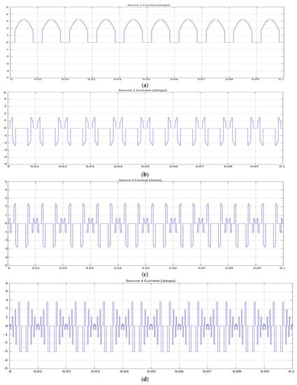 The inputs used for the simulation of the 31-level MPUC ML inverter are as given below. Figure 6a–d represents the input current sources one, two, three, and four of the 31-level MPUC MLI. The improvement in level shifting demands additional input sources in the circuit, and their corresponding values are: (i) current source one requires 3.24 A; (ii) input current source two ranges up to 1.5 A; (iii) current source three is approximately 2.3 A; and (iv) input current source four ranges up to 2.8 A. A varied range of input currents aids in providing performance improvement.