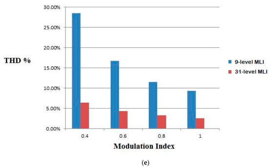 The simulation results of the FFT Analysis of the 31-level packed U-cell multi-level inverter for different modulation indices (say, 1, 0.8, 0.6, and 0.4) are depicted by Figure 8a–d. Table 5 represents the comparison table of the THD Analysis of the MLI. And, Figure 8e represents the comparison of the THD Analysis chart.