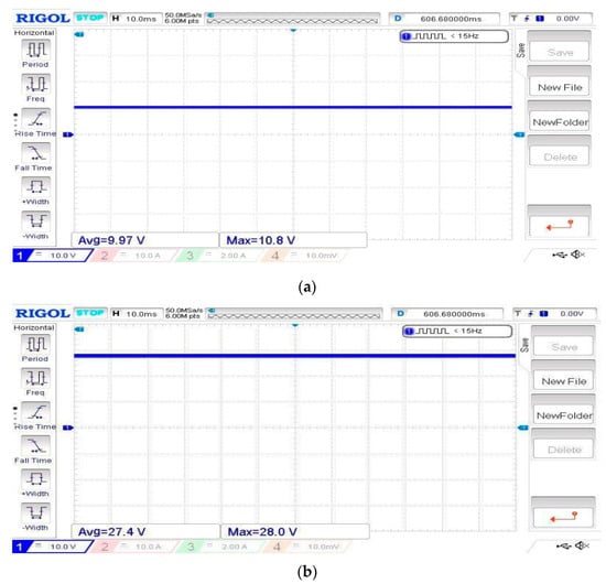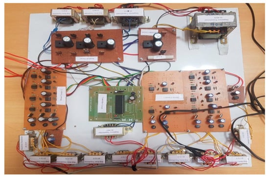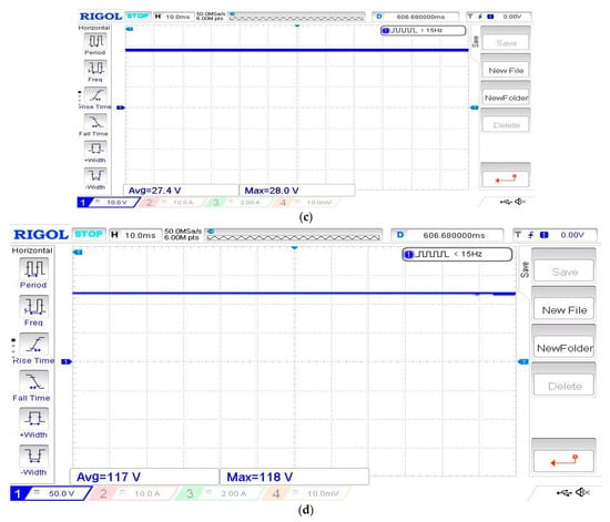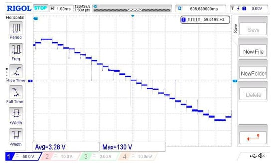 Considering the simulation results and the FFT analysis, it is found that the designed 31-level MPUC multi-level inverter performs better than the 9-level MLI. As a next step, a hardware prototype for the proposed model is designed, and the various input and output results are obtained. The model predictive control algorithm is implemented on a PIC microcontroller, and the hardware prototype results are obtained. The complete hardware setup of the 31-level MPUC MLI is given in Figure 9. Figure 10a–e shows the switching pulses that trigger that inverter circuit. Figure 11a–d represents the four inputs at the inverter circuit. The output of the inverter is given in Figure 12.