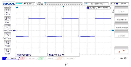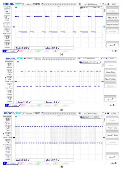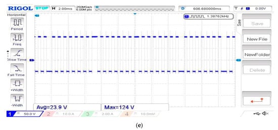 The modulation signals given to switches, their switching carried out, and their switching output pulses are observed. There are five switches, and their switching pulses are given by Figure 10a–e.