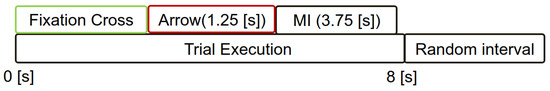 Figure 2 shows the sequence in time of each trial for both the training and the test phases, beginning at time . The sequence begins with an initial resting phase () during which the participant relaxes and concentrates on the session to be performed. After the initial resting phase, as shown in Figure 2, the trials start with the fixation cross that appears on the screen (see Figure 3b). Afterward, it is overlaid with an arrow at the center of the monitor for 1.25 , pointing either to the left or to the right (as shown in Figure 3a,c). In this phase, depending on the direction of the arrow, the subject is instructed to imagine a left- or right-hand movement for 3.75 . Each trial lasts = 8 in total. One entire training run includes twenty trials per class (forty in total), while one entire test run includes ten trials. Overall, in order to evaluate the performance of the training and test phases, subjects were required to stay focused for 7 for the training phase and 2 for the testing phase.