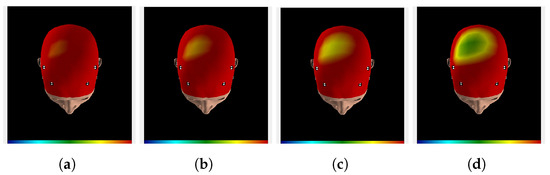 EEG topographical distribution of subject A during the training phase. (a) Fixation cross 0 [s], (b) Arrow cue at 2.75 [s], (c) MI task starting at 4.25 [s], (d) MI task at 5.25 [s].