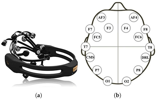 Neuroheadset headset and its spatial configuration. (a) Emotiv EPOC X; (b) Electrodes configuration.