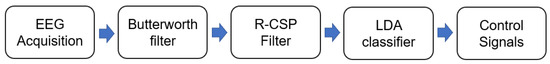 With the final aim of developing a complete framework to command home appliances, we selected some of the most reliable approaches to pre-process and classify EEG data. In particular, filtering, the application of an RCSP filter, and a final classification performed by an LDA classifier are the three main stages that comprise the post-processing analysis and classification, summarized in the following text. A graphical block representation of these three main phases is shown in Figure 6.
