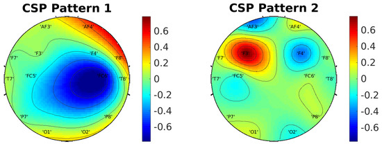 where is an a priori defined regularization parameter. The more the spatial filters satisfy it, the lower is. Hence, to maximize , should be minimized, thus ensuring that the spatial filters satisfy the prior. This approach has been selected since it collects the spatial filters with the highest discriminative power. The aim was to avoid possible CSP sensitivity to noise and overfitting. We refer the reader to Figure 7 for an illustration of the set of CSP scalp projections generated with the RCSP algorithm for one participant in the user study.