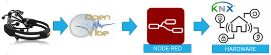 First, EEG data were recorded through Emotiv EPOC X through the 14 sensors that subjects placed on their scalp. EMOTIVPRO allowed interactions with a fixed workstation. Then, OpenVIBE (http://openvibe.inria.fr/, accessed on 11 July 2023) was integrated to perform the signals’ post-processing, feature extraction, and classification for both the training and the testing phases. Lab Streaming Layer (LSL), an open-source software framework for real-time acquisition and synchronization of various types of data, facilitated the data exchange between EMOTIVPRO and OpenVIBE. Once the feature extraction and classification phases were complete, Node-RED, an immediate programming tool for interconnecting hardware devices, APIs, and online services over TCP/IP, used the gathered information for both commanding the different hardware devices according to the users’ intentions and received feedback about the status of the devices.