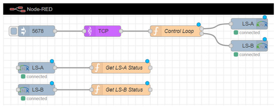 The designed software architecture makes use of Node-RED for the software association between the OpenVIBE outputs and the KNX real devices, fully using its advantage of being highly suitable for low-level programming of event-driven applications and for making stable connections between hardware components. A schematic representation is shown in Figure 9. The data transfer is performed over TCP via a custom Node-RED library which sends classified signals in string form. After an initial set of the port number within the Inject block, the TCP Client Node block can be set up in listening mode. This allows for listening of the data coming from OpenVIBE over TCP. Afterward, the users’ provided commands are decoded to drive the selected devices; the devices’ states are continuously fed back to the system and then sent to the real devices by using the KNXs blocks.