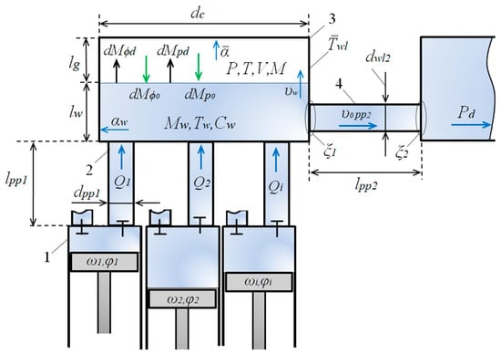 In general, when developing a mathematical model of the working processes in the gas cap of a piston pump, four main objects can be distinguished: the piston pump (1), the connecting pipeline (2) between the pump and gas cap, the gas cap (3) and the connecting pipeline from the gas cap (4) (see Figure 1).