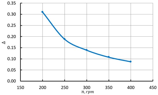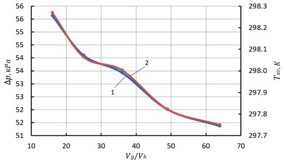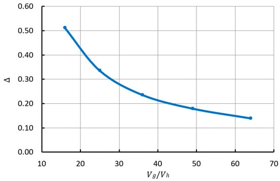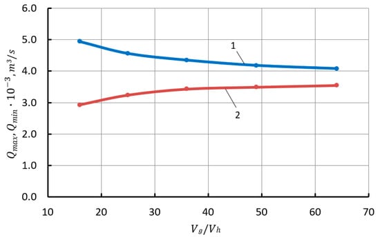 In accordance with the previously obtained results in [,], an increase in the ratio Vg/Vh leads to a decrease in the irregularity of the pump flow (see Figure 2). The resulting dependence is hyperbolic in nature. From the presented results, we can conclude that an acceptable feed irregularity (less than 10%) is achieved at Vg/Vh more than 70%.