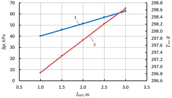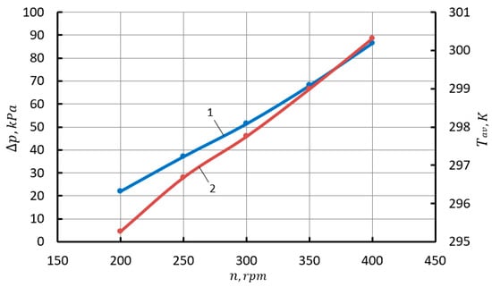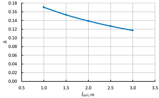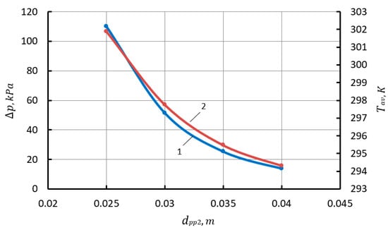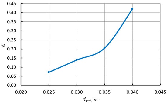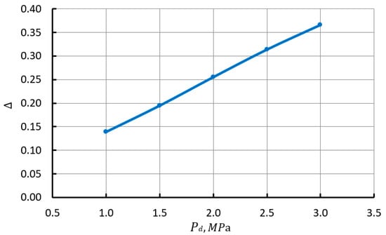 As a base point, we take a point with the following independent variables: Vg/Vh = 64; lpp2 = 2 m; dpp2 = 0.03 m; nrev = 300 rpm. The calculation starts from the crankshaft rotation angle ; in this case, the pressure and temperature in the gas cap were set arbitrarily, while the pressure in the gas cap was set not much higher than the discharge pressure (pd), and the temperature was set equal to the temperature of the liquid. The instantaneous supply of liquid from the pump cylinder through pipeline 2 to gas cap 3 was calculated. Then the gas cap and pipeline 4 were calculated. When calculating the pipeline, an equation was used to determine the fluid flow rate without taking into account inertial losses. The calculation was carried out with a step according to the crankshaft rotation angle . After the calculation for one rotation of the crankshaft, the initial and final pressure values in the gas cap were compared. If the difference in the obtained pressures was less than 1 kPa, the calculation was stopped; if not, the calculation was started anew, while the obtained final thermodynamic parameters of the gas and liquid in the cap became the initial ones. In most of the calculation options performed, the number of iterations did not exceed 25.