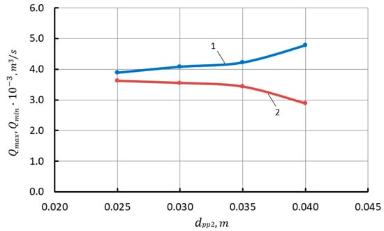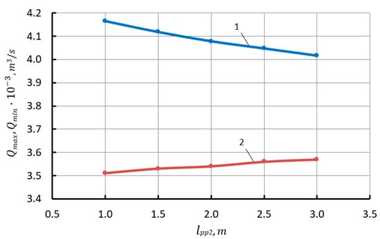 When determining the fluid flow rate in pipeline 4, the number of iterations was limited to 50, while the discrepancy in determining the rate was set to less than 1%. During the calculation, at each iteration, the value of the maximum flow rate in pipeline 4 during the crankshaft rotation from 0 to 2π was determined—Qmax, the minimum value of the liquid flow rate—Qmin, and the average integral value of the liquid flow rate—Qav.
