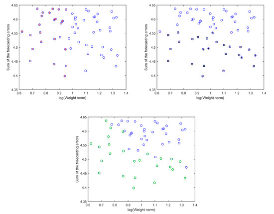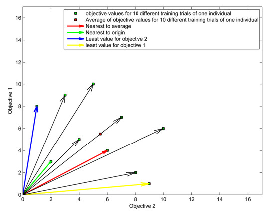 As the problem is multi-objective, there are several ways for identifying which training trial is the best one. One strategy is to select the training trial whose Euclidean distance from the origin is the smallest. The green arrow in Figure 3 illustrates this situation for . In the second strategy, the average of objective values for all training trails is calculated, and then the trial whose value is the closest to the average value will be selected as the best one (i.e., red arrow in Figure 3).