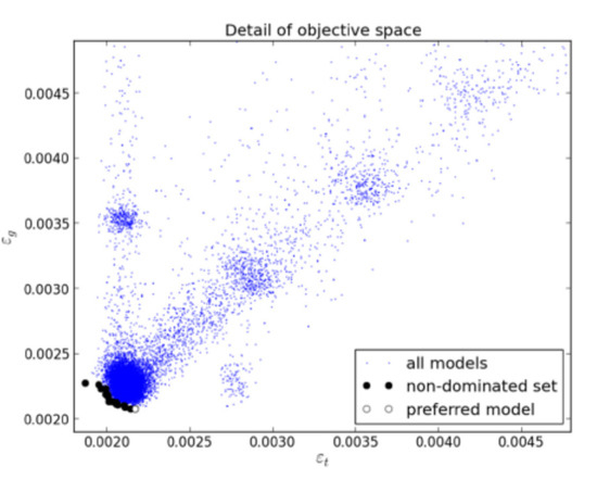 After having executed the specified number of iterations, we have performance values of npop * niter different models. As the problem is multi-objective, a subset of these models corresponds to non-dominated models (nd), or Pareto solutions. If one or more objectives is (are) set as restriction(s), a subset of nd, denoted as preferential solutions, pref, corresponds to the non-dominated solutions, which meet the goals. An example is shown in Figure 4.