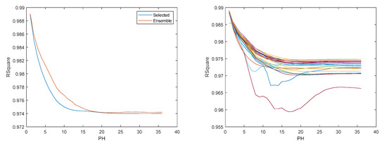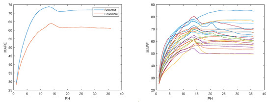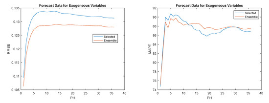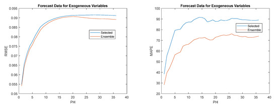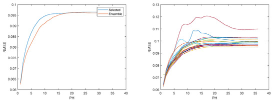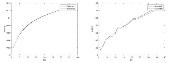 Secondly, the optimization objectives and goals need to be defined. Typical objectives are Root-Mean-Square Errors (RMSE)-evaluated on the training set (), or on the test set (), as well as the model complexity, #(v)—number of nonlinear parameters—or the norm of the linear parameters (). For forecasting applications, as it is the case here, one criterion is also used to assess its performance. Assume a time-series sim, a subset of the design data, with p data points. For each point, the model (14) is used to make predictions up to PH steps ahead. Then, an error matrix is built: