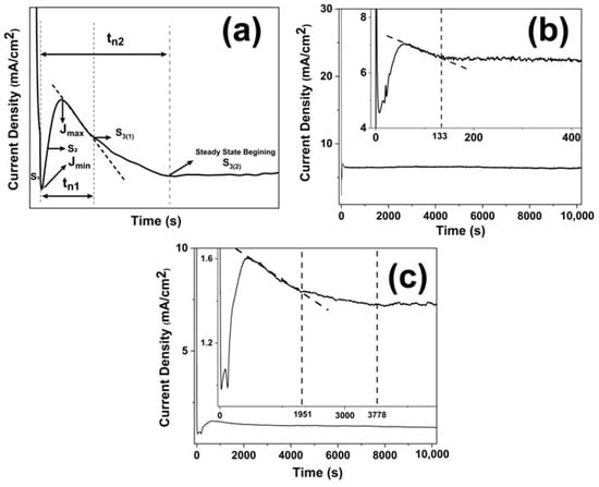 Current density responses while titanium is being anodized: (a) standard form, (b) using an aqueous electrolyte without XG, and (c) using an aqueous electrolyte with XG.
