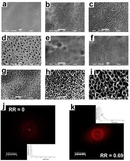 The nanotube ordering could be measured, however, both qualitatively and quantitatively. FFT images from SEM images could be used to measure the ordering qualitatively. Figure 2j,k display FFT images from SEM pictures of TiO2 nanotubes generated in aqueous electrolytes without XG and with XG, respectively. In our previous work [], based on the paper by Stępniowski [], we analyzed the form of the FFT images. Therefore, in nanotube structures with lesser organization, the FFT form can take on many geometrical shapes; for example, in Figure 2j, a blurred ellipse was created; however, other polygonal forms, or a blurred image without a defined shape, might also be produced. However, a nanotube structure with a higher organization had an FFT picture with a circular form (see Figure 2k). From the FFT images, it is clear that the organization of nanotubes produced in aqueous electrolytes with XG was higher than those made in aqueous electrolytes without XG. Circularity in FFT images has been used as an indication of nanostructure organization by several authors [,,,,,,,]. FFT pictures could be used for quantitatively measuring the TiO2 nanotubes’ ordering. Due to this, the averaged regularity ratio (RR) approach, which is based on FFT measurements, was employed. Its equation is:
