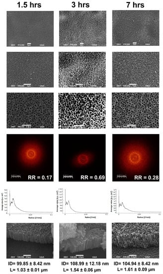 SEM pictures of nanotube coatings produced with various anodization periods are shown in Figure 3; the other experimental parameters (pH = 3, 0.5 wt.% XG, and 0.5 wt.% NaF) remained the same. After 1.5 h of anodization, structured nanotubes were visible on the surface, showing separate walls, typical of this type of structure; nevertheless, some of the nanotubes had particles on the tip. As viscous electrolytes present an slower etching rate, such particles stay on the surface; the origin could be related to a compact, thin titanium dioxide coating that was produced early in the process of creating nanotubes and was only partially dissolved [,]. These particles could be linked to a short anodization time, which was not enough to dissolve them []. The TiO2 nanotubes generated by 3 h of anodizing process did not show particles on the nanotube tips; thus, this anodization time allowed time to dissolve them. Longer anodization times (7 h) also produced TiO2 nanotubes covered by particles; however, those could be generated by the nanotube corrosion in the electrolyte due to the prolonged anodization time []. Regarding the nanotube organization measured by RR, the best result was obtained in the nanotubes produced in 3 h. For the nanotubes formed in 1.5 h, the time was not enough to create very organized nanotubes; on the other hand, prolonged anodization times were not beneficial to the homogeneity and organization of the nanotubes. Concerning the internal diameter of TiO2 nanotubes, for the three anodizing times evaluated, the values were about 100 nm. However, a direct relationship between the anodization time and the length of TiO2 nanotubes was evident for the samples obtained at 1.5 and 3 h, and this behavior is congruent with previous reports [,]. On the other hand, there were no differences between the nanotube lengths of the samples obtained at 3 and 7 h. This result could be due to the effect of the corrosion process mentioned above [,].