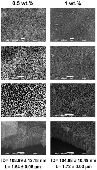 The SEM pictures of nanotube coatings produced using different XG concentrations while keeping the same values for the other experimental parameters (pH = 3, 0.5 wt% NaF, and 3 h) are shown in Figure 5. From Figure 5, it can be seen that the nanotubes made using 1 wt.% of XG (see 10,000× SEM picture) had a dense layer covering the nanotubes, contrarily to the nanotubes produced at 0.5 wt.% of XG which were clean. Moreover, the nanotubes produced utilizing 1 wt.% of XG had a lower circularity than those made at 0.5 wt.% (see 50,000× SEM picture). Regarding the nanotube length, there is a slight increase in length due to the increase in XG concentration. With the rise in XG concentration, the electrolyte viscosity rises []. The viscosity has a direct effect on the nanotube’s morphologic characteristics. A higher viscosity causes the diffusion rate to slow down, which makes the ions move more slowly, especially the fluoride ions, allowing for a higher thickness [,,]. According to our results, the XG concentration that induces the production of more organized and clean nanotubes was 0.5 wt.%.